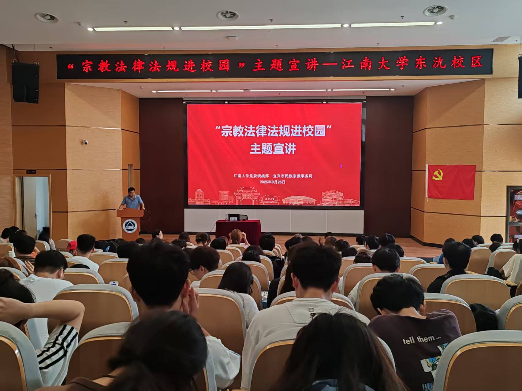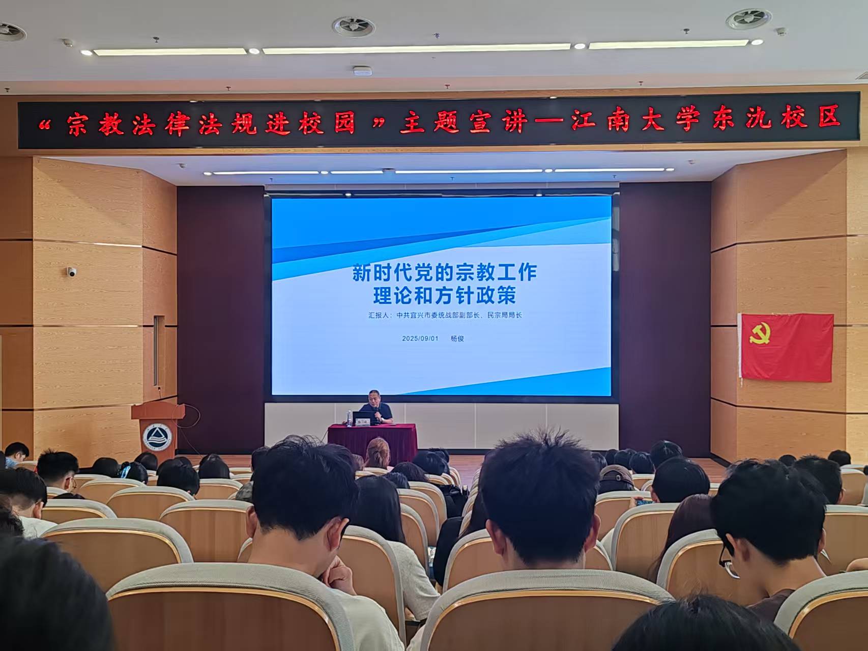 为深入学习贯彻新时代党的宗教工作理论和方针政策,切实加强研究生思想政治教育与法治观念培养,引导青年学子树立正确的宗教观、严守纪律底线,9月26日下午,我校东氿校区在清源楼101会议厅成功举办“宗教法律法规进校园”主题宣讲活动。本次讲座特邀中共宜兴市委统战部副部长、市民族宗教事务局局长杨俊担任主讲。