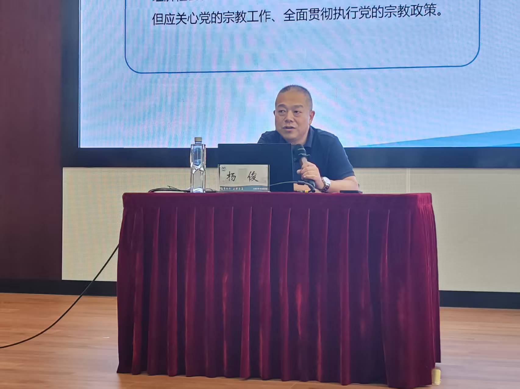 宣讲活动中,杨俊以“新时代党的宗教工作理论和方针政策”为核心主线,紧密结合当前宗教工作的新形势、新任务以及高校人才培养的根本要求,进行了系统而深入的解读。他详细阐释了我国宗教工作的基本方针、现行宗教法律法规体系,重点解读了《中国共产党章程》和《中国共产主义青年团章程》中关于党员、团员不得信仰宗教的明确规定,强调这是重要的政治纪律和组织原则。