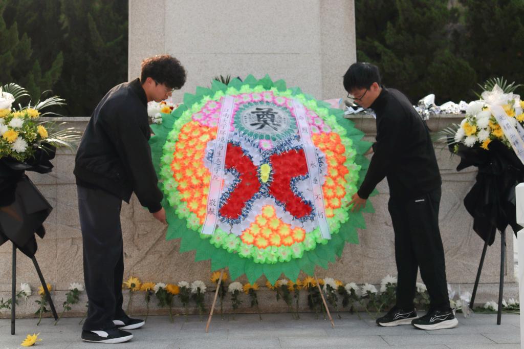 随后,全体肃立齐唱国歌,激昂歌声回荡陵园上空,彰显青年赤诚。学生代表缓步上前,向纪念碑敬献花圈;全体人员三鞠躬,以庄重仪式缅怀英烈、致敬忠魂。仪式上,本科生党员代表白珊珊、团员代表王俊力先后发言。白珊珊号召党员以先烈为榜样,将初心融入专业学习;王俊力承诺青年将传承革命精神,以实干担当书写青春答卷。