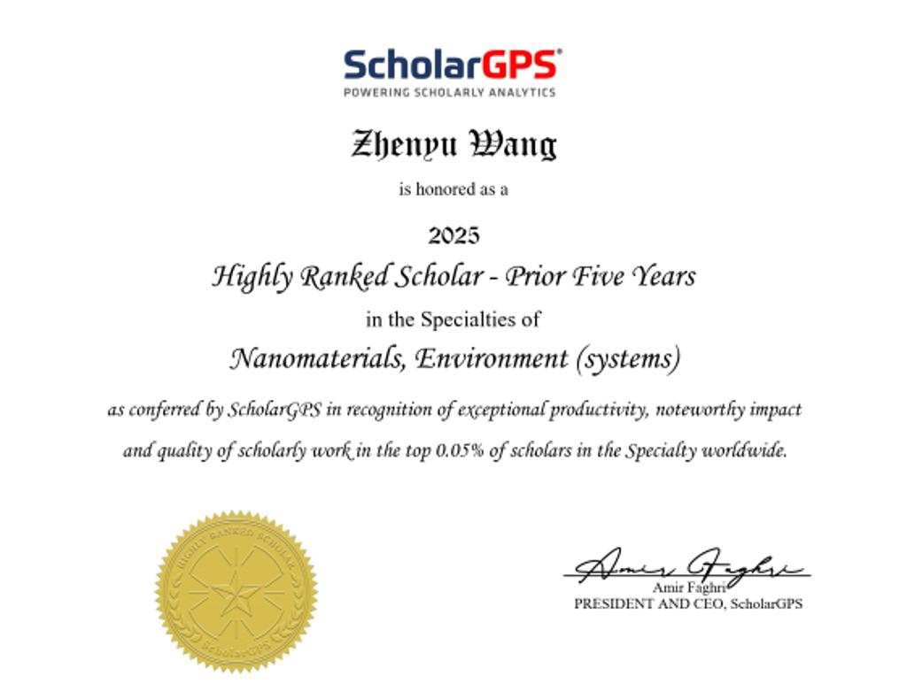近日,国际知名学术大数据平台ScholarGPS正式发布2025年度“全球前0.05%顶尖科学家”榜单。我院王震宇教授凭借在纳米材料与环境领域的卓越贡献和高影响力,同时入选纳米材料、环境领域及综合领域(所有领域)的“近五年成就榜”(Highly Ranked Scholar- Prior 5 Years)。此前,王震宇教授已入选斯坦福大学“全球前2%顶尖科学家”榜单。这充分体现了我院教师在科学研究和学术影响力方面的持续提升与突破。