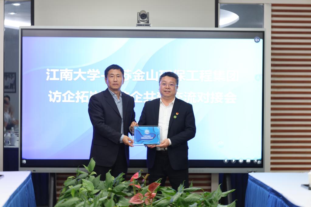 环境与生态学院党委书记杨延、马克思主义学院党委书记杨飏、商学院党委书记刘长青先后介绍各学院服务企业方案,围绕人才培养、技术服务、就业对接、思政赋能、管理创新等方面,展现学院助力企业高质量发展的特色优势。环境与生态学院院长何锋重点推介学院核心科研领域与产业应用方向,分享环保技术研发与成果转化成果;2017届校友、浙江清风源环保科技有限公司董事长张福鑫结合自身创业经历,介绍企业主营方向与技术布局,为校企合作搭建桥梁。在交流研讨环节,校企双方就实习实践基地建设、联合技术攻关、毕业生定向输送等议题深入交换意见。随后,戴月波向蒋正伟授予江苏金山环保工程集团为江南大学“大学生就业最佳战略合作伙伴”,标志着双方校企合作进入新阶段。