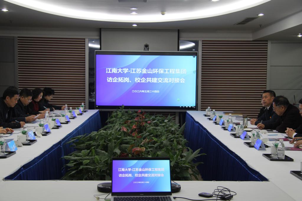 为深入贯彻落实党中央、国务院关于高校毕业生就业工作的决策部署,深化产教融合、校企合作,拓宽毕业生就业渠道,2026年3月24日,江南大学党委常委、副校长戴月波率队赴江苏金山环保工程集团,开展“访企拓岗、校企共建”交流活动。江南大学对外合作与市校共建处处长黄敏,环境与生态学院党委书记杨延,环境与生态学院院长何锋,马克思主义学院党委书记杨飏,商学院党委书记刘长青,环境与生态学院党委副书记、副院长胡娟,以及环境与生态学院2017届校友、浙江清风源环保科技有限公司董事长张福鑫等一同参加活动。江苏金山环保工程集团高质量发展顾问吴熙安,集团副总经理蒋正伟、吴文华、李明等热情接待了江南大学一行。